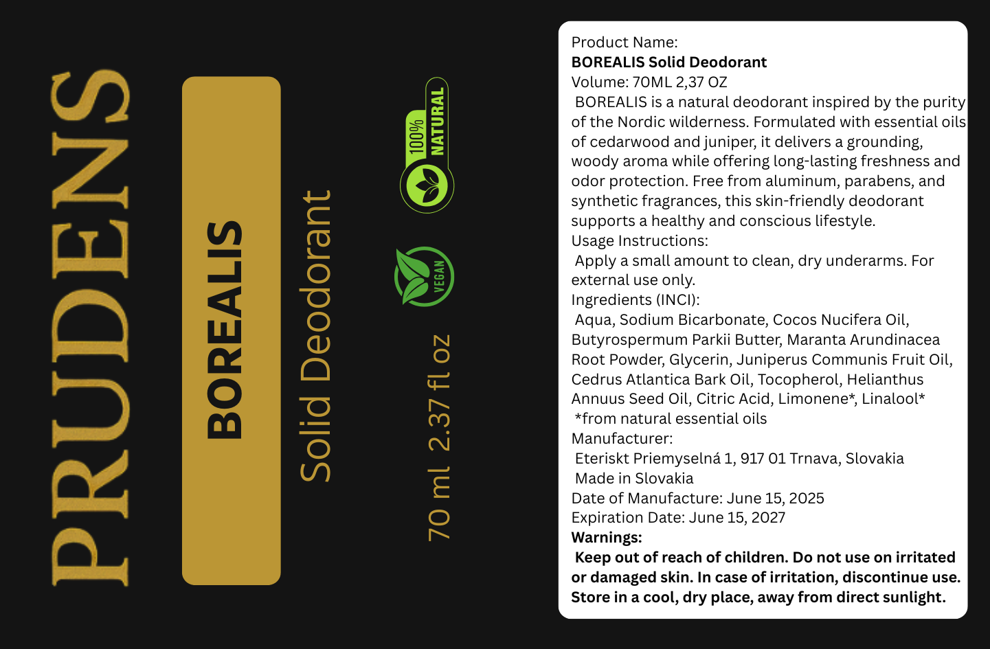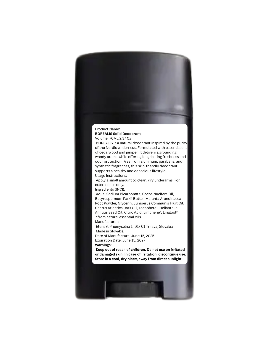 BOREALIS is a natural deodorant inspired by the purity of the Nordic wilderness. Formulated with essential oils of cedarwood and juniper, it delivers a grounding, woody aroma while offering long-lasting freshness and odor protection. Free from aluminum, parabens, and synthetic fragrances, this skin-friendly deodorant supports a healthy and conscious lifestyle.