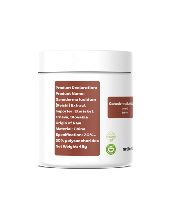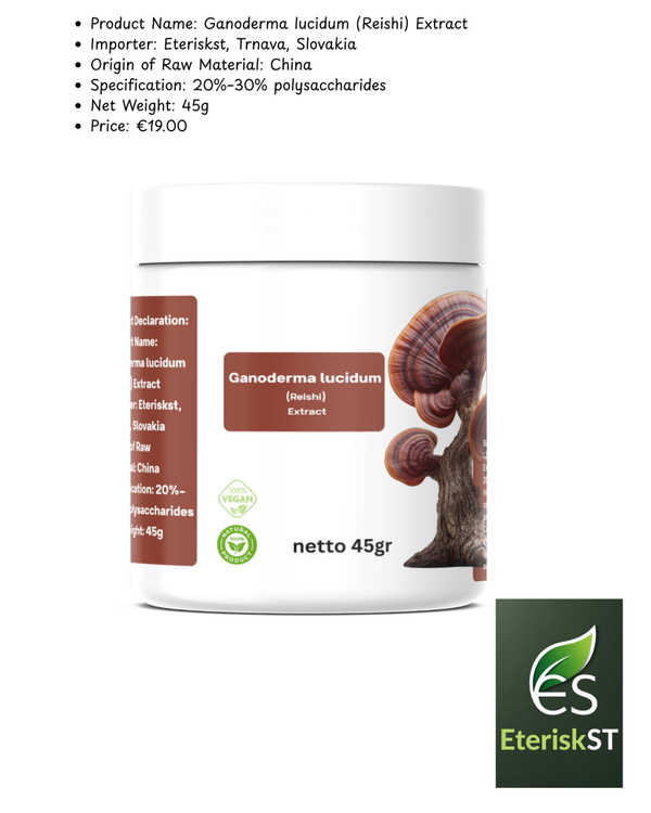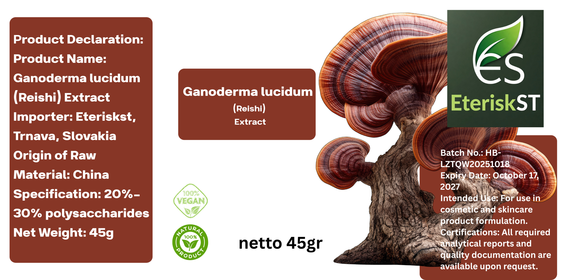 Premium Ganoderma lucidum (Reishi) extract sourced from China, imported by Eteriskst, Slovakia. This high-potency extract contains 20–30% polysaccharides, making it ideal for enhancing the efficacy of cosmetic formulations. Reishi is renowned for its antioxidant, anti-inflammatory, and skin-rejuvenating properties.