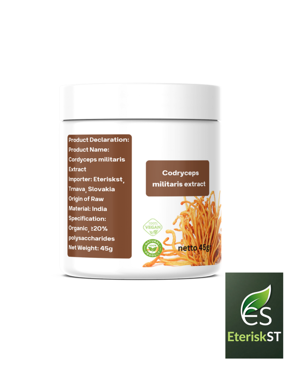 Organic-certified Cordyceps militaris dual extract, rich in bioactive polysaccharides (≥20%). Known for its energizing and oxygenating properties, it enhances skin vitality and resilience when used topically.